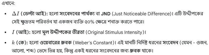 ওয়েবারের সূত্র বলে যে, একটি উদ্দীপকের ন্যূনতম যে পরিবর্তনটুকু একজন মানুষ অনায়াসে (Just Noticeable Difference বা JND) অনুভব করতে পারে, তা সেই আসল বা মূল উদ্দীপকের তীব্রতার একটি ধ্রুবক অনুপাত