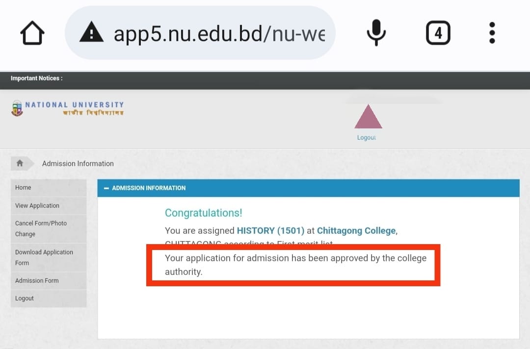 অনলাইনে লগইন করার পর “Your application for admission has been approved by the College authority” লিখা থাকলে নিশ্চিন্তে থাকতে পারেন,কলেজ আপনার ভর্তি কনফার্ম করেছে।